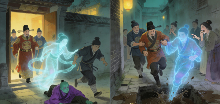 话音刚落,门外走进一个锦衣男子,正是那富商,身后跟着几个家丁。道士见事情败露,想趁机逃跑,却被苏婉的鬼魂缠住,片刻便没了气息。富商吓得魂飞魄散,被家丁扶着狼狈而逃,却在巷口失足掉进粪坑,被众人笑话了许久。