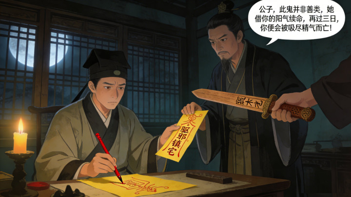 柳砚心中不安,请来道士作法。道士一看他的气色,脸色大变:“公子,此鬼并非善类,她借你的阳气续命,再过三日,你便会被吸尽精气而亡!”说罢,道士画了一道符,让他贴在房门上,又给了他一把桃木剑,嘱咐他夜里无论听到什么,都不可开门。