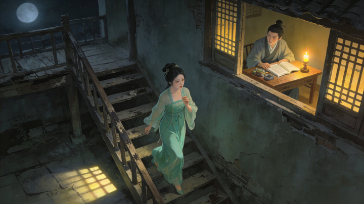 书生柳砚赴京赶考,盘缠耗尽,见小楼无人居住,便暂借落脚。入夜,他正挑灯读书,忽闻楼下传来细碎脚步声,伴着婉转的歌声,柔媚得能勾走魂魄。柳砚探出头,见一女子身着水绿罗裙,身姿曼妙,眉眼含愁,正是传闻中的苏婉。