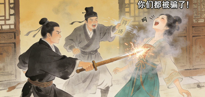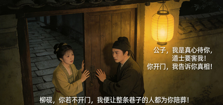 当夜,苏婉果然来了,拍门声急促,哭声凄厉:“公子,我是真心待你,道士要害我!你开门,我告诉你真相!”柳砚心有动摇,却想起道士的话,死死抵着门。门外的哭声渐渐变成冷笑,语气变得奸狠:“柳砚,你若不开门,我便让整条巷子的人都为你陪葬!”