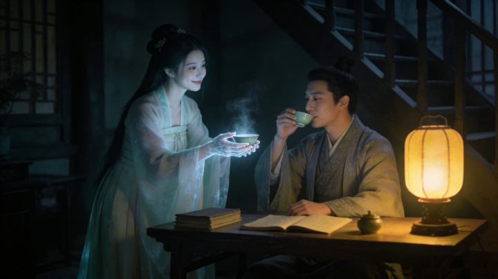 女子抬头,冲他浅浅一笑,声音软糯:“公子深夜苦读,妾身为你奉茶。”柳砚虽知是鬼,却被其美貌吸引,竟不畏惧,邀她上楼。苏婉指尖冰凉,递来的茶盏泛着寒气,柳砚饮罢,只觉浑身清爽,连日疲惫尽消。